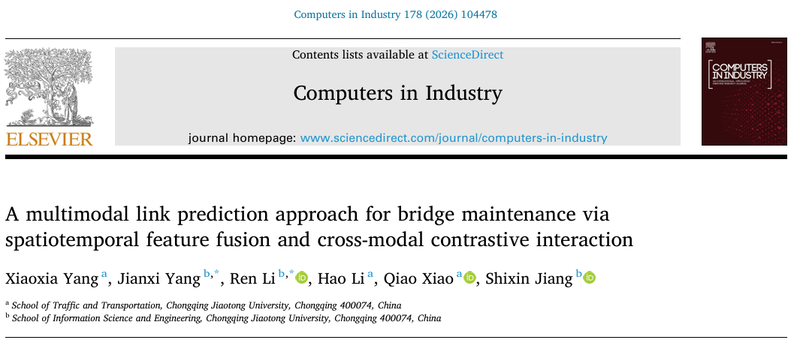 近日,重庆交通大学信息科学与工程学院杨建喜教授团队的最新研究成果“A multimodal link prediction approach for bridge maintenance via spatiotemporal feature fusion and cross-modal contrastive interaction”在计算机科学学科高水平SCI期刊《Computers in Industry》(中科院一区TOP,JCR一区,影响因子9.1)正式发表。团队博士生杨小霞为该论文第一作者,杨建喜教授、李韧教授为共同通讯作者,参研人员还包括蒋仕新副教授和博士生李昊、肖桥。