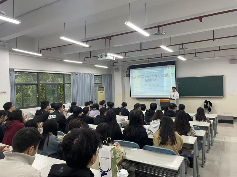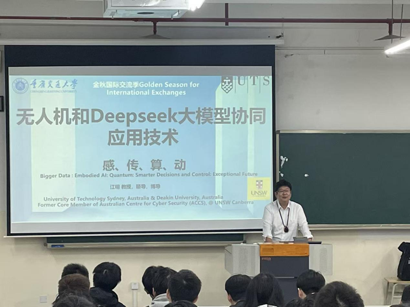 学生国际学术视野,了解人工智能与无人机领域的最新研究进展,信息科学与工程学院于2025年10月29日在南岸校区教学楼三教302举办了国际视野大讲坛。本次讲座邀请到澳大利亚迪肯大学(Deakin University)副教授江明作题为《无人机DeepSeek大模型协同应用技术》的专题报告。学院教师及百余名研究生参加了讲座。