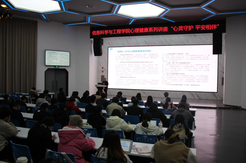 信息科学与工程学院高度重视关心同学们身心健康和学业情况,为落实心理健康教育与服务,助力学生识别与应对常见心理问题,信息科学与工程学院心理健康分中心举办的“心灵护航,平安相伴”心理健康系列专题讲座Ⅱ——“大学生常见心理问题的识别与应对策略”,于11月26日19:00,在南岸校区大数据中心拉开帷幕。