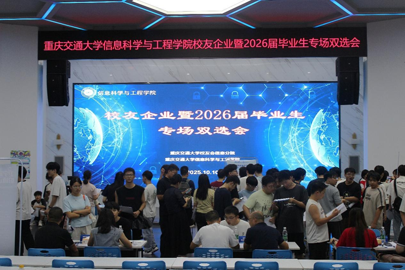 2025年10月10日,重庆交通大学信息科学与工程学院校友企业暨2026届毕业生专场双选会,在南岸校区第一教学楼智慧交通大数据中心圆满落下帷幕,信息科学与工程学院党委书记王辉老师、院长杨建喜老师、党委副书记蒋攀老师、辅导员彭娅、王延鹏和胡小容老师亲临现场,学校招生就业处副处长袁理老师、就业市场建设科科长彭晋老师也到双选会现场指导工作。本次双选会得到了学校校友会信息分会、产学研处的支持帮助,双选会圆满举办为2026届毕业生搭建了精准对接的就业平台,更成为学院链接校友资源、深化校企合作的重要纽带。