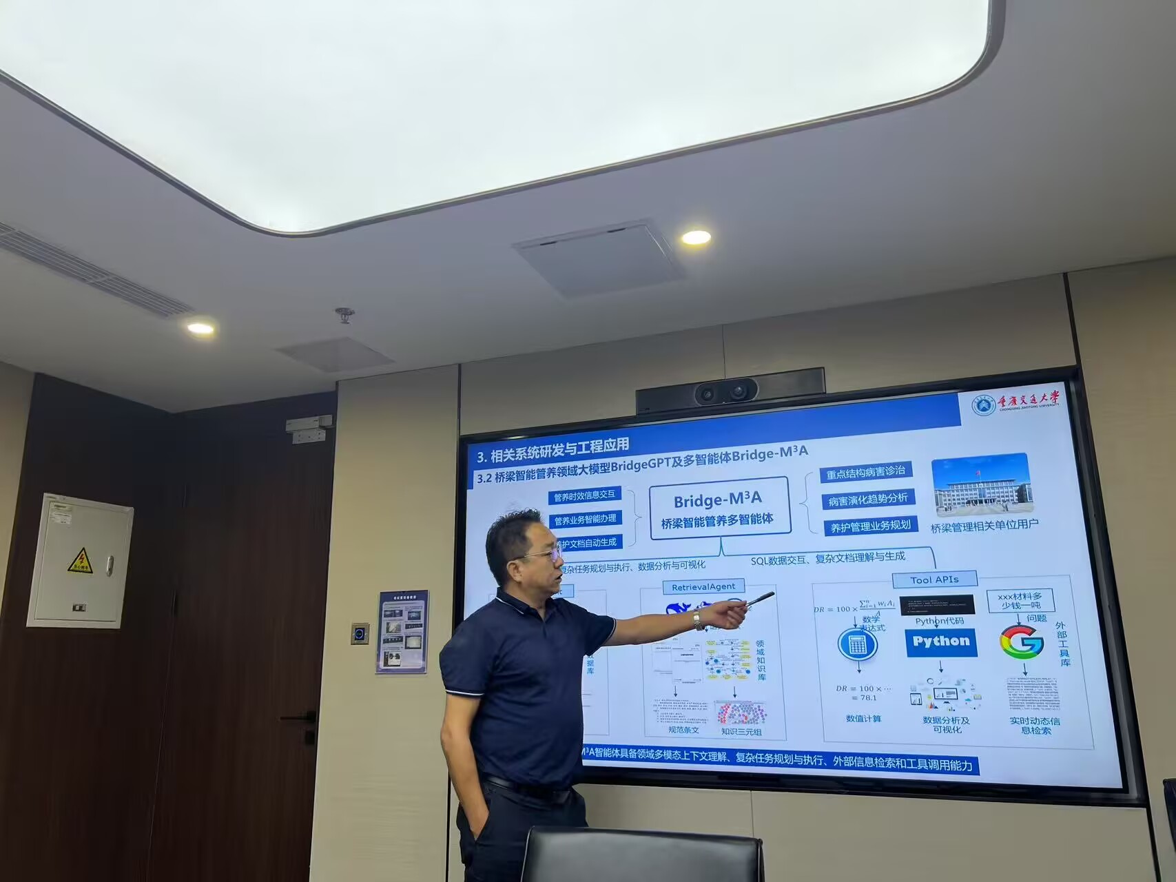 座谈会上,杨建喜院长介绍了学院在智慧交通、人工智能、大数据等领域的科研优势与发展方向,尤其是生成式大模型在交通基础设施智能管养领域的相关成果。中交公路规划设计院相关负责人介绍了企业在人工智能辅助设计等方面的科研情况,尤其是近年来其在科技创新、数字化转型等方面取得的成果。双方围绕智慧交通领域前沿技术、人才培养、项目合作等展开深入研讨,探寻合作方向。