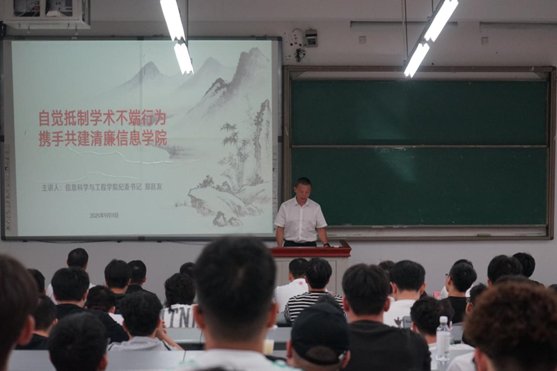 9月11日上午,信息科学与工程学院在科学城校区A01237教室隆重举行2025级研究生入学教育与学术诚信教育。会议由学院党委副书记蒋攀主持,党委书记王辉、正处级组织员兼纪委书记郑廷友、副院长蓝章礼、学科办副主任刘洋、研究生辅导员王新、研究生导师代表蒋仕新、研究生代表莫天金及全体2025级研究生新生参会。