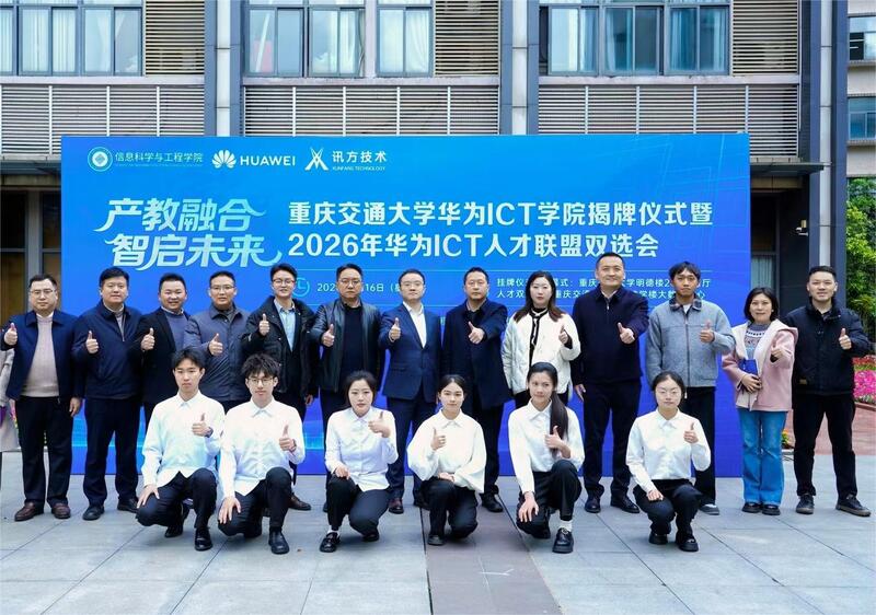 3月16日,经过前期的精心谋划准备,重庆交通大学华为ICT学院揭牌仪式暨2026年华为ICT人才联盟双选会在重庆交通大学顺利举行。华为重庆政企副总经理洪朴、四川讯方信息技术有限公司重庆区域总监秦绪锋及华为生态伙伴代表出席活动;重庆交通大学副校长郑丹,教务处、招生就业处负责人及信息学院师生代表参加活动。本次活动由重庆交通大学信息科学与工程学院主办,华为技术有限公司、四川讯方信息技术有限公司协办,以“挂牌+双选”一体化模式,推动校企协同育人与人才精准对接落地见效。活动由学校信息学院院长杨建喜主持。