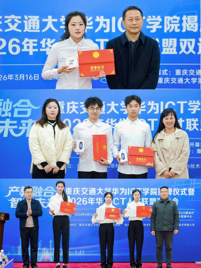 在全场嘉宾的共同见证下,校企双方领导共同为重庆交通大学华为ICT学院揭牌。现场随即举行第一期培训学员获奖学生颁奖仪式,到场领导嘉宾为在ICT专业学习、技能竞赛与认证中表现优异的学生颁发奖项,对他们的努力与成果予以表彰,同时勉励全体学子以榜样为标杆,深耕ICT专业领域,练就过硬的技术本领。